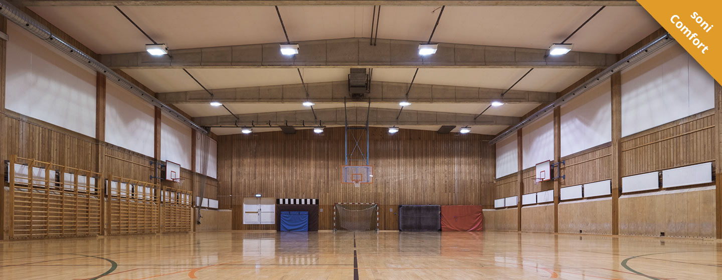 1. Schallabsorbierende Decken: Der Einsatz von schallabsorbierenden Deckenplatten ist eine effektive Maßnahme, um die Nachhallzeit zu reduzieren. Diese Deckenplatten bestehen aus Materialien, die den Schall absorbieren und so verhindern, dass er ungehindert im Raum reflektiert wird. Unser Produkt soni COMFORT ist für den Einsatz in Turn- und Sporthallen perfekt geeignet und erfüllt als Deckenelement die Ballwurfsicherheitsprüfung gemäß DIN 18032-3.