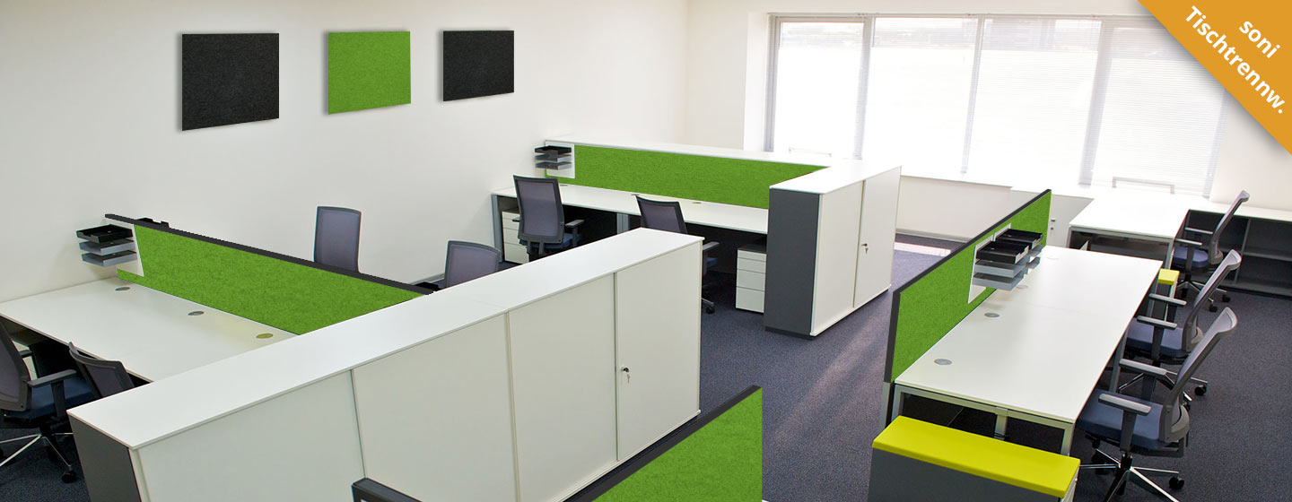 I nostri pannelli fonoassorbenti soniflex per uffici svolgono un’azione fonoassorbente, creando un ambiente di lavoro piacevole in uffici open space, call center e strutture simili. Ottimizzano l’acustica ambientale e potenziano l’intelligibilità del parlato in ogni postazione di lavoro. I nostri elementi antirumore sono realizzati in materiali di alta qualità e il loro design aggiunge un tocco di colore a qualsiasi ambiente d’ufficio.