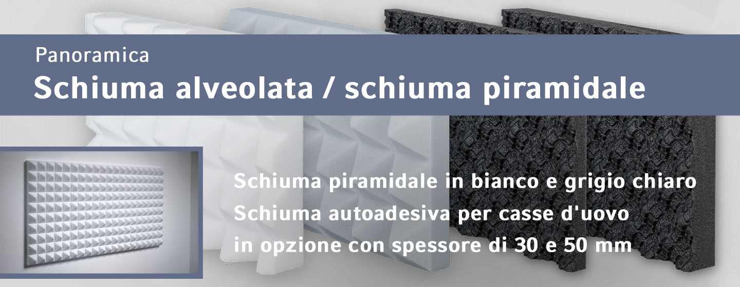 schiuma piramidale sono le schiume acustiche più comunemente conosciute e sono giustamente considerate come ottimi assorbitori di suono. Grazie alla superficie ondulata, si ottengono eccellenti valori di assorbimento in tutte le gamme di frequenza.